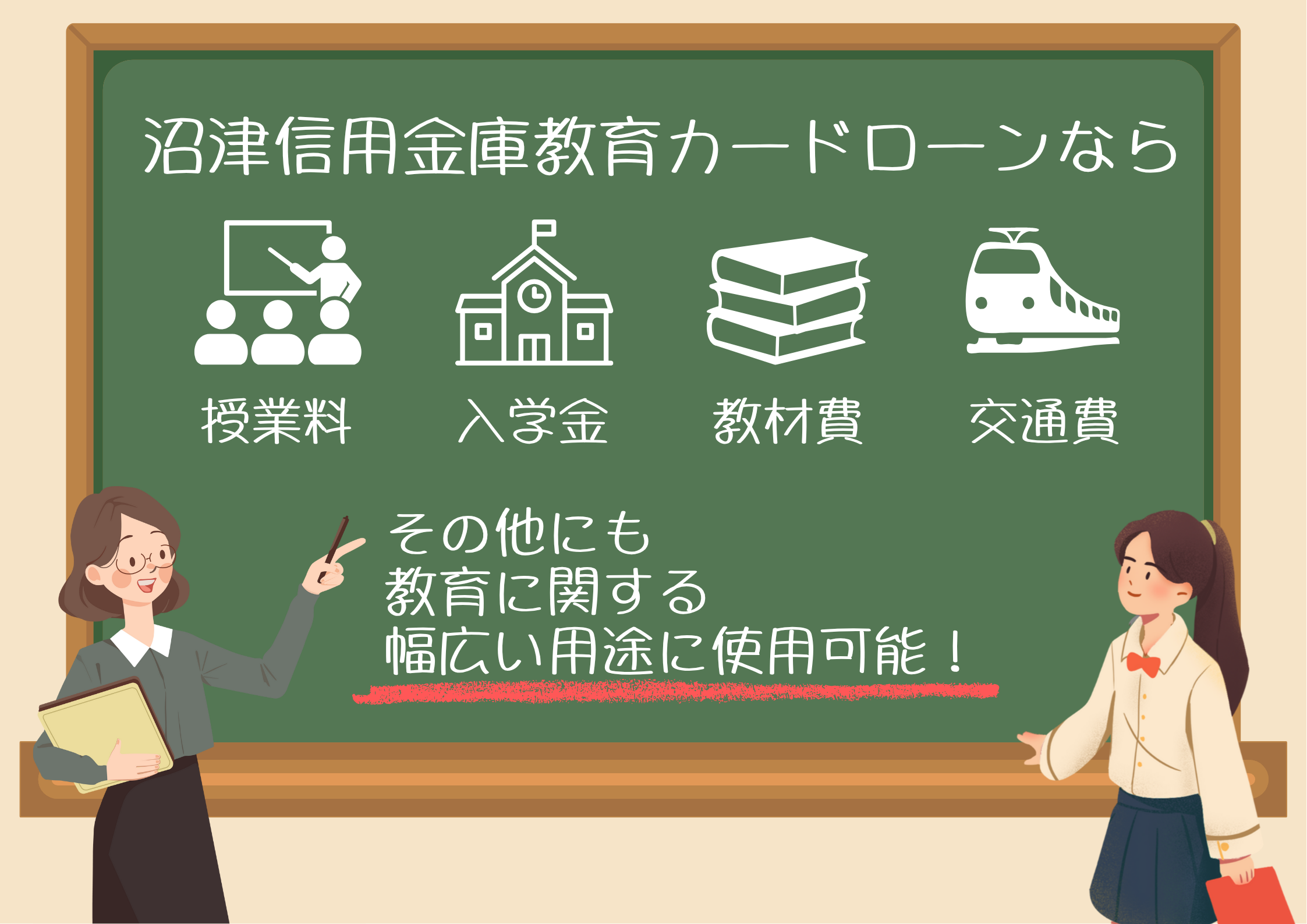 授業料や入学金はもちろん、教材費、交通費、授業料、下宿費用など教育に関するさまざまな資金にご利用いただけます。