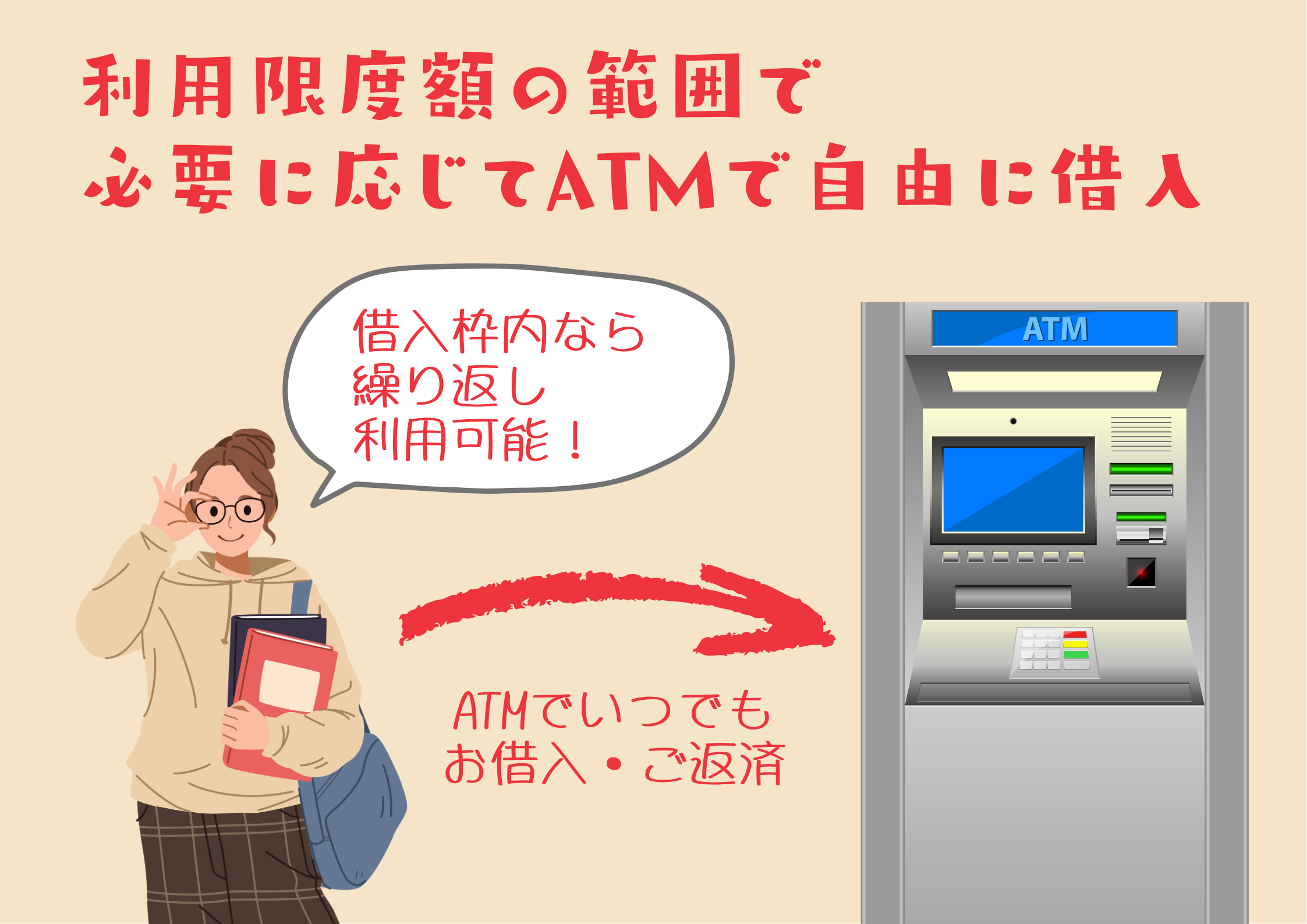 審査結果に応じた利用限度額の範囲で必要に応じてATMで自由に借入が可能です。